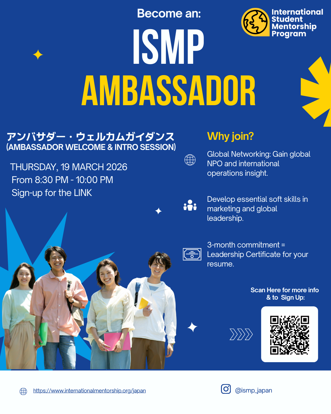 The ISMP Ambassadors Program is a premier leadership opportunity for current university students in Japan who are passionate about building multicultural connections and making a real impact on campus.